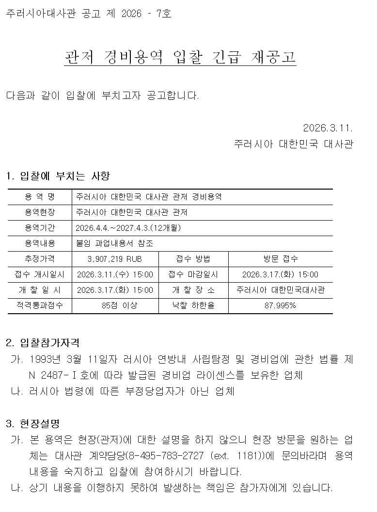 [주러대사관][공지] 관저 경비용역 입찰 공고(재공고)