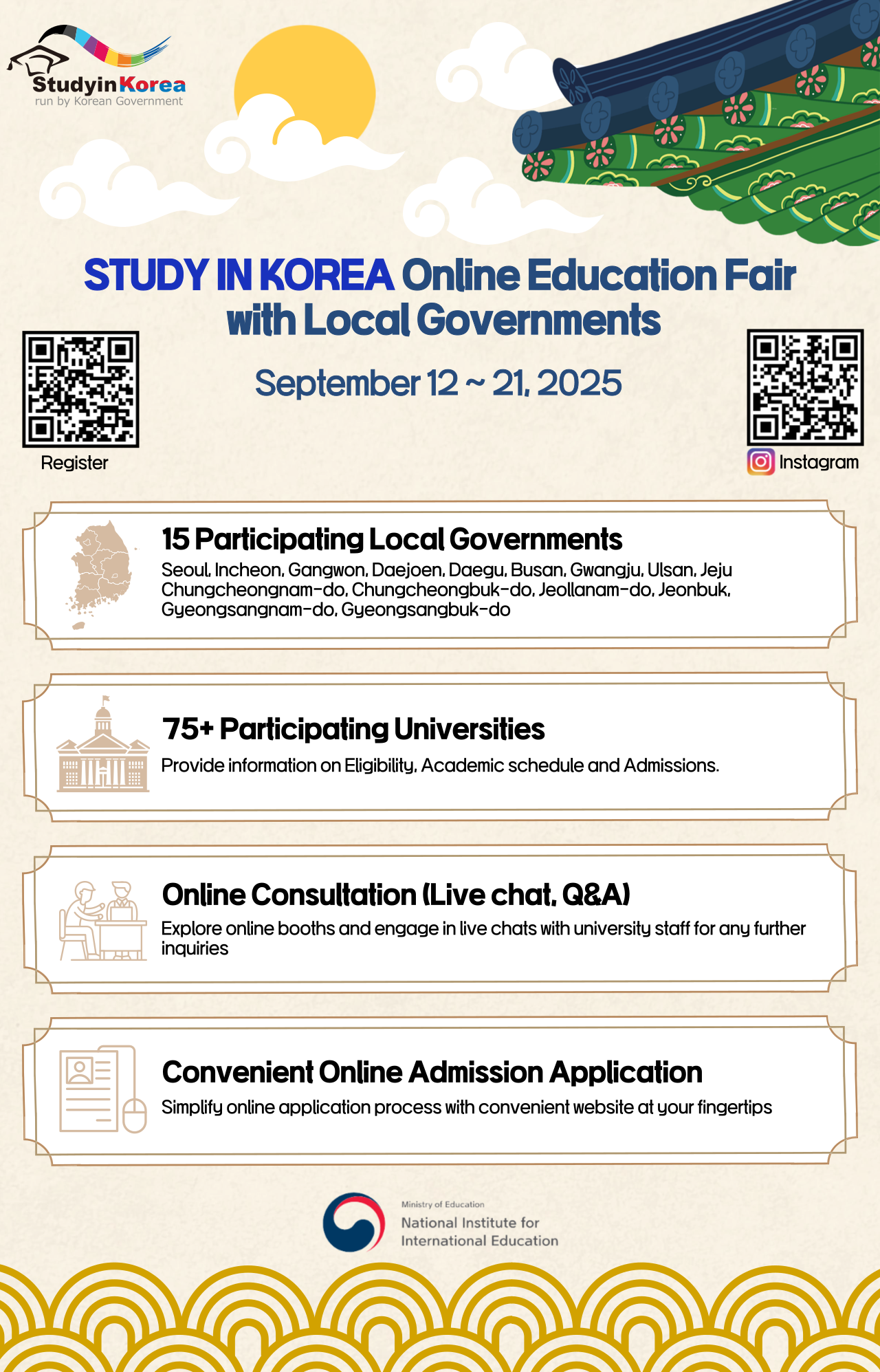 교육부 산하 국립국제교육원에서 우수한 외국인 유학생 유치확대 및 다변화를 위해 온,오프라인 해외 한국유학박람회를 개최하오니 한국유학에 관심있는 분들의 적극적인 참여 부탁드립니다.